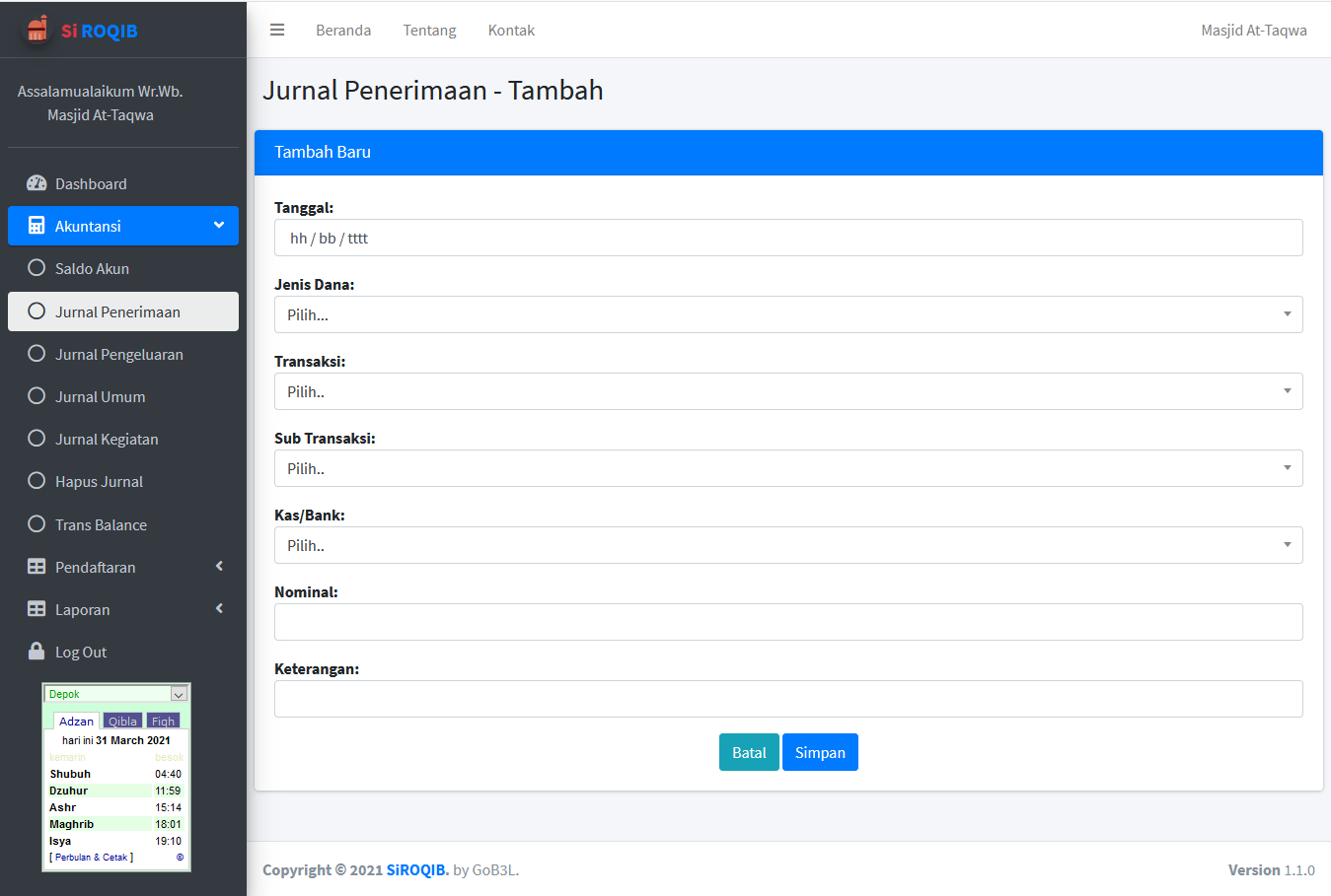 Modul jurnal transaksi dapat dipergunakan untuk transaksi penerimaan dan pengeluaran keuangan Masjid/ Mushola secara online