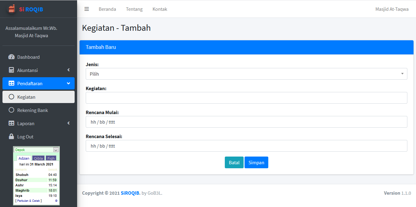 SiROQIB adalah salah satu Sistem Informasi yang diperuntukkan untuk Pencatatan Keuangan semua kegiatan dilingkungan Masjid.
